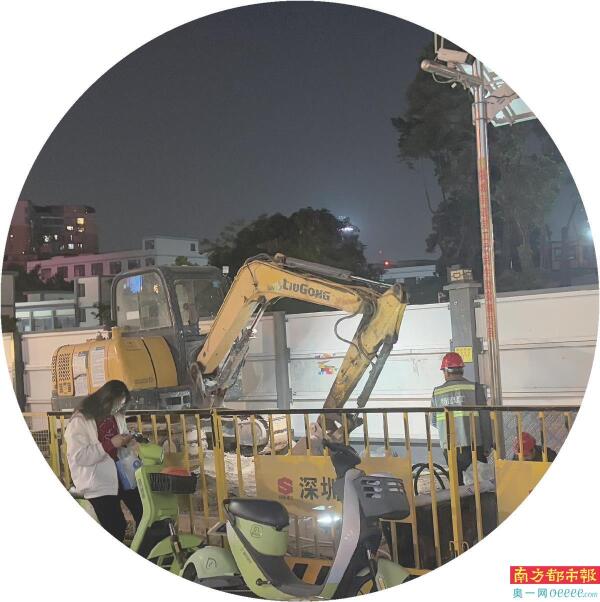 从茜坑地铁站B出口到数百米外的中国石化加油站这一段路,半个月前还在装修的“肯悦咖啡”已开业,其门前的几处工地则未显示出明显施工进展。围挡之内,或堆放着散乱的建材,或覆盖着绿色的防尘网,还有几台布满泥垢的建筑机械。有过往市民表示,这里夜间施工断断续续,有时可见施工作业,有时则没有。