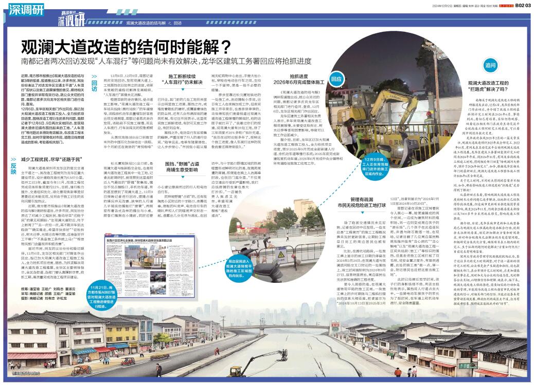 观澜大道改造的结与解之回访 近期,南方都市报推出《观澜大道改造的结与解》调研报道,报道推出以来,许多市民、网友纷纷表达了对该龙华区交通主干道“人车混行”现状以及施工进展缓慢的意见,期待相关部门重
