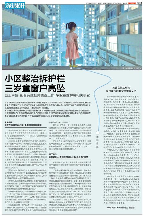 日前,在深圳上班的罗先生向奥一新闻反映称,其家人在北京一小区租住,今年因小区进行综合整治,租住房屋窗户外的防护栏被拆,后来三岁半女儿从窗口坠下并当场死亡。其认为,此前施工方未作风险防范告知、未采取