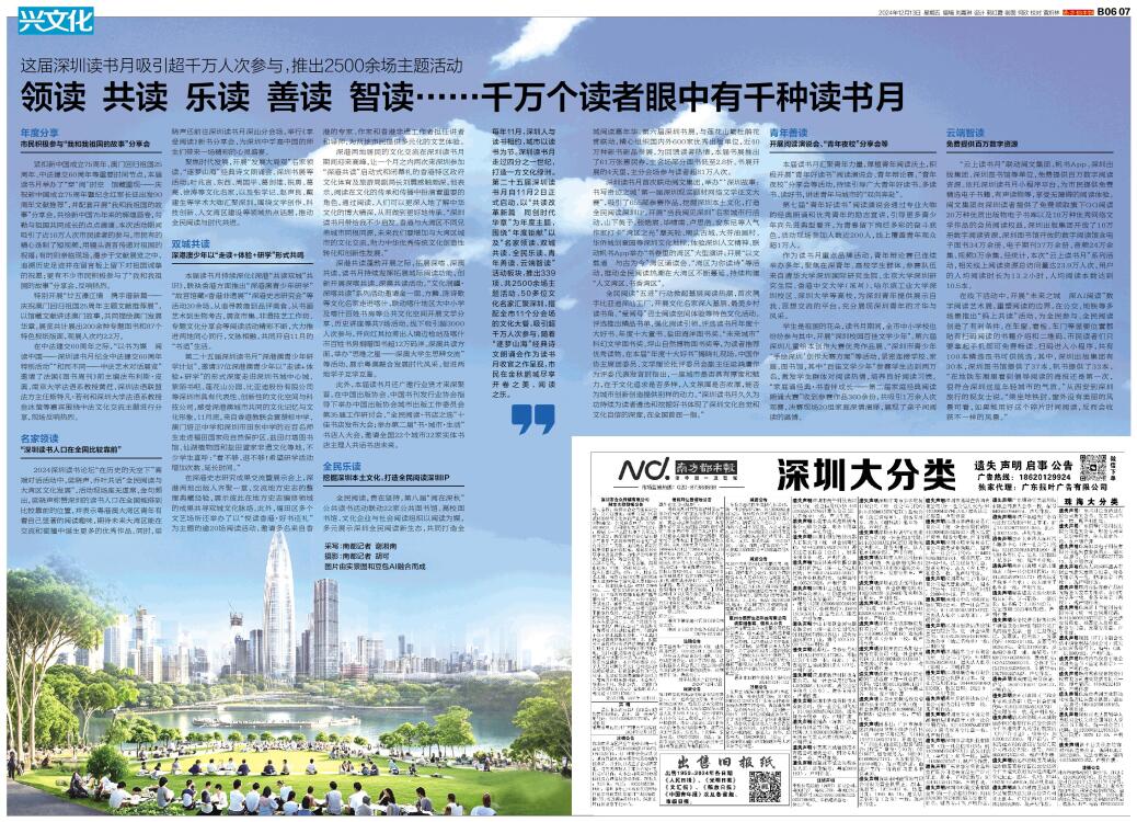 每年11月,深圳人与读书相约,城市以读书为节。深圳读书月走过四分之一世纪,打造一方文化绿洲。第二十五届深圳读书月自11月2日正式启动,以“共读改革新篇 同创时代华章”为年度主题,围绕“