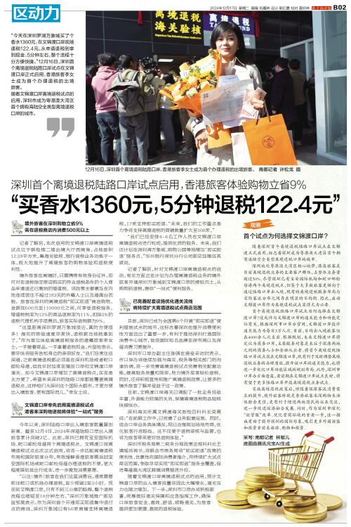 “今天在深圳罗湖万象城买了个香水1360元,在文锦渡口岸现场退税122.4元。从申请退税到拿到现金,5分钟左右,整个流程十分方便快捷。”12月16日,深圳首个离境退税陆路口岸试点在文锦渡口岸正式启