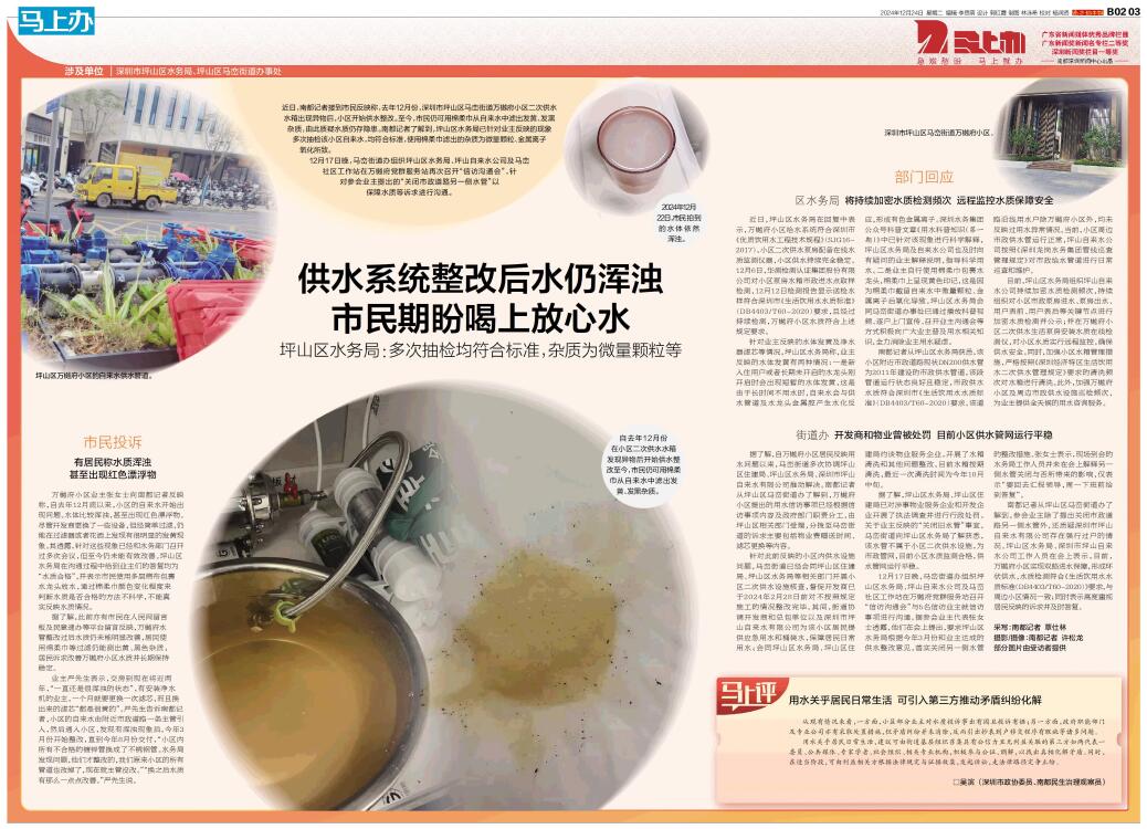 涉及单位 深圳市坪山区水务局、坪山区马峦街道办事处 近日,南都记者接到市民反映称,去年12月份,深圳市坪山区马峦街道万樾府小区二次供水水箱出现异物后,小区开始供水整改。至今,市民仍可用棉柔巾从