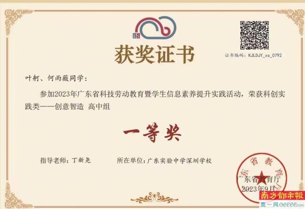 2023年7月,广东省科技劳动教育暨学生信息素养提升实践活动吸引了来自全省各地近1000所学校的900多支队伍,4000多名师生参加现场比拼交流。省实深圳初中组刘奕轩、邓子琪和高中组叶舸、何雨薇4名学生出色发挥,最终双双斩获该项目广东省一等奖。