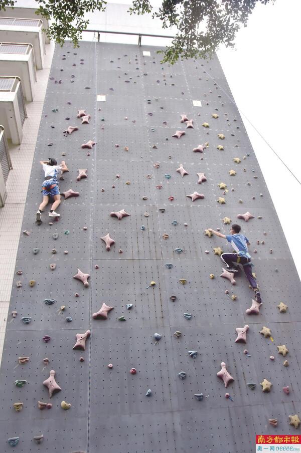 全区唯一设置在校内的攀岩墙,学子们在攀岩课程中勇攀高峰。