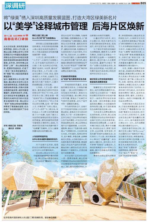 从大沙河长廊、深圳湾滨海休闲带西段、深圳人才公园、大南山公园,到南山区中心河项目荣获2024年国际风景园林师联合会亚非中东地区风景园林奖能源和碳减排类别荣誉奖。近年来,深圳市南山区持续“上新”,将