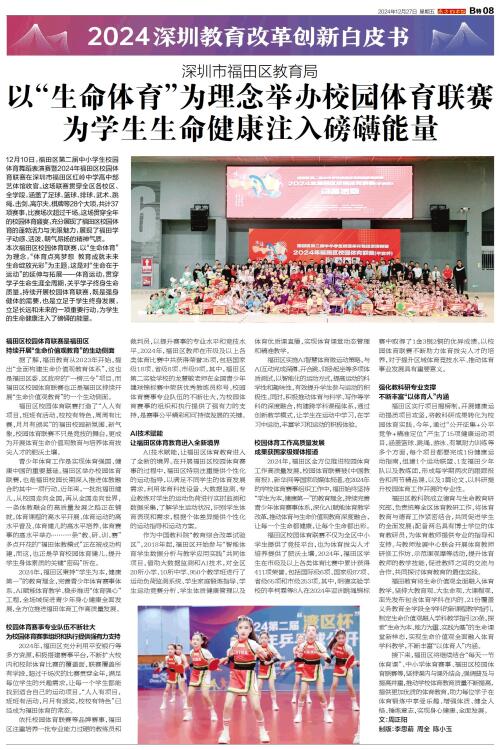 12月10日,福田区第二届中小学生校园体育舞蹈表演赛暨2024年福田区校园体育联赛在深圳市福田区红岭中学高中部艺体馆收官。这场联赛贯穿全区各校区、全学段,涵盖了足球、篮球、排球、武术、跳绳、击剑、