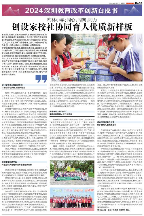 家校社协同育人是落实立德树人根本任务的重要基础。长期以来,学校教育、家庭教育、社会教育之间存在着体系零散、落实表面、合力较弱的问题。深圳市福田区梅林小学以“以人为本,自主发展”为办学理念,信守“六