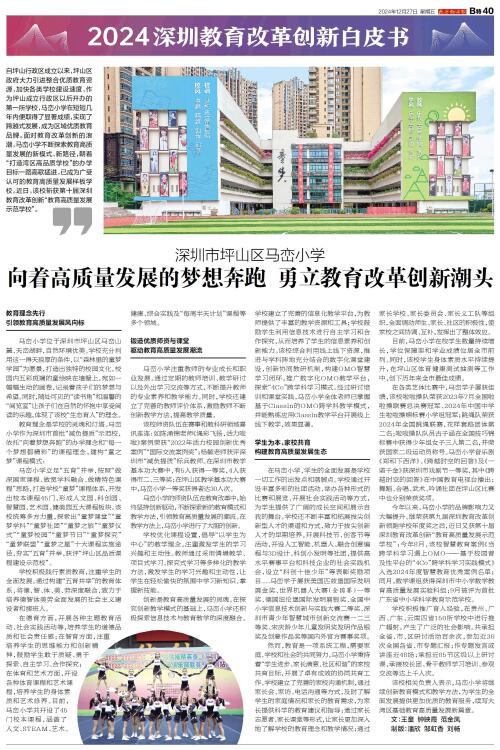自坪山行政区成立以来,坪山区政府大力引进整合优质教育资源,加快各类学校建设速度,作为坪山成立行政区以后开办的第一所学校,马峦小学在短短几年内便取得了显著成绩,实现了跨越式发展,成为区域优质教育品牌