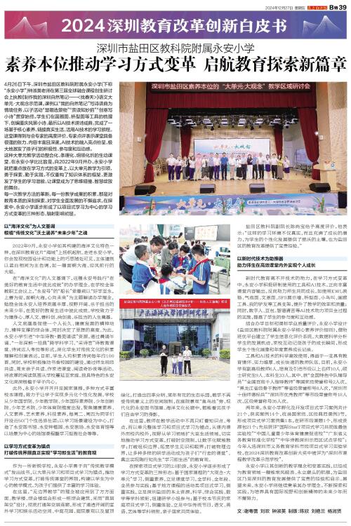 4月26日下午,深圳市盐田区教科院附属永安小学(下称“永安小学”)钟淑英老师在第三届全球融合课程创生研讨会上执教《制作我的深圳自然笔记——<找春天>》语文大单元·大观念示范课。课例以“