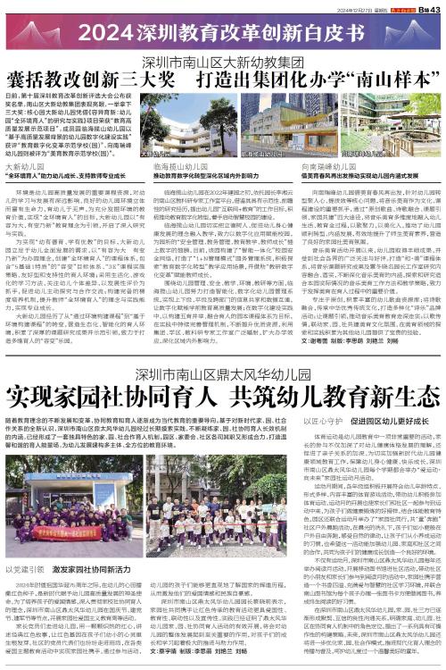 随着教育理念的不断发展和变革,协同教育和育人逐渐成为当代教育的重要导向。基于对新时代家、园、社合作关系的全新认识,深圳市南山区鼎太风华幼儿园经过长期摸索实践,不断凝练家、园、社协同育