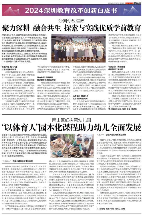 2023年3月15日,深圳市南山区沙河幼教集团正式成立,标志着南山区学前教育迈入了一个新的发展阶段。集团以“融合共生,多元发展”为教育原则,以红树湾幼儿园为核心,联合世纪村幼儿园、华侨