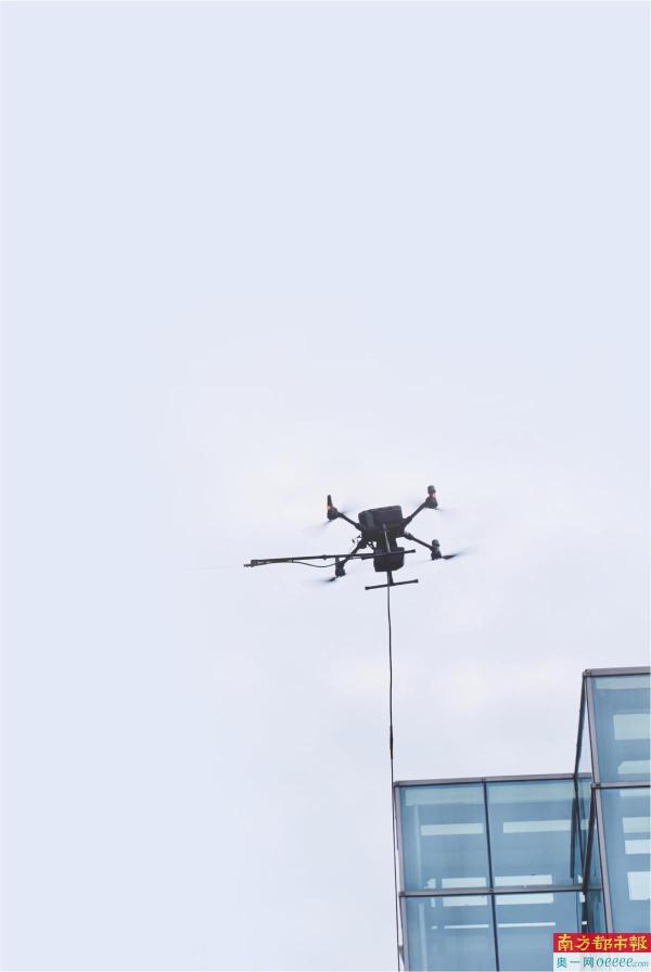 深圳罗湖一公司推出一项创新技术,无人机与机器人合作可以在上百米的高空进行玻璃幕墙清洗。 南都记者 冷锋 摄