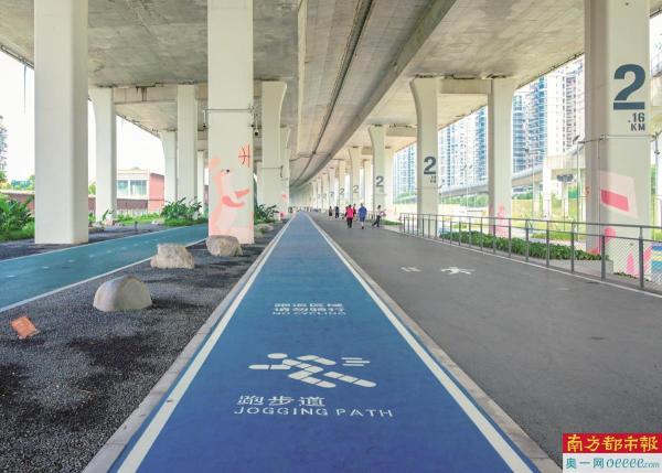 在广深沿江高速大桥的下面,一条新开放的桥底绿色骑行步道穿梭在城市的山海间,原本被闲置的桥底空间摇身一变,成了都市版的“绿野仙踪”,在这里,你可以一脚踏进葱茏的绿意,一步跨入海浪的涟漪,沉浸式体验“山海相连,城在景中”的自然馈赠。