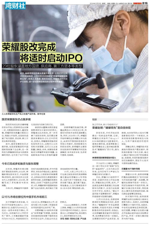 近日,南都湾财社记者从荣耀方面获悉,公司已于12月28日完成股改,公司名称正式变更为“荣耀终端股份有限公司”。相关人士透露,股改完成后,荣耀将适时启动IPO流程,进一步消息将在相应的过程中对外披露。