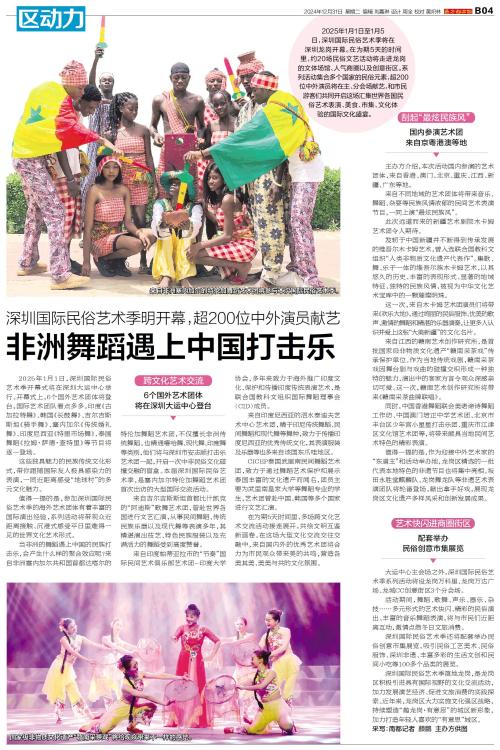 2025年1月1日至1月5日,深圳国际民俗艺术季将在深圳龙岗开幕。在为期5天的时间里,约20场民俗文艺活动将走进龙岗的文体场馆、人气商圈以及创意街区。系列活动集合多个国家的民俗元素,超200位中外