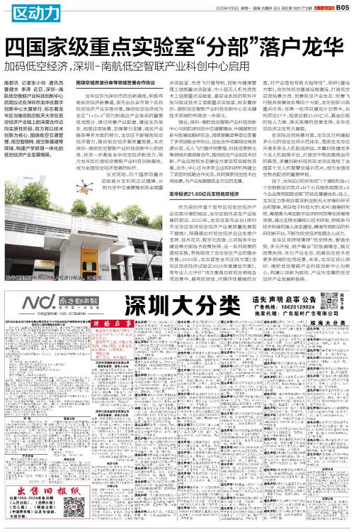 南都讯 记者张小玲 通讯员 曹健夫 李涛 近日,深圳-南航低空智联产业科技创新中心启用仪式在深圳市龙华区数字创新中心大厦举行,标志着龙华区与南京航空航天大学在低空经济产业链上的深度合作迈向实质性阶