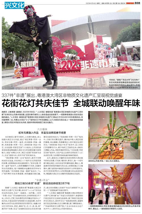 南都讯 记者黄璐 霍健斌 2025年1月8日,“‘人文湾区·璀璨非遗’粤港澳大湾区非物质文化遗产汇深圳展”在深圳关山月美术馆启幕。这是在春节被列入人类非遗成功的背景下,一场聚焦粤港澳大湾区非遗全貌
