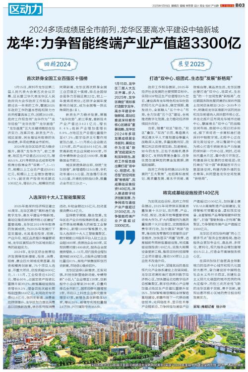 1月15日,龙华区二届人大五次开幕。步入2025年,龙华区确定“高标准打造数字龙华,高水平建设中轴新城,高站位推进深圳都市核心区建设”重要战略。龙华区2024年多项发展成绩居全市前列,展现出作为区