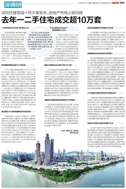 1月13日,深圳市住房和建设局发布深圳住建领域十件大事。2024年深圳楼市止跌回稳,一二手住宅成交超10万套;全年实施加装电梯400台,累计发放加装电梯补贴2.04亿元;城中村“瓶改管”攻坚全面完