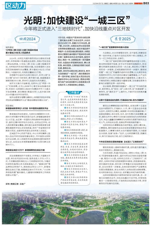 光明城区。 深圳光明供图 1月15日,中国共产党深圳市光明区第二届代表大会第三次会议召开。大会总结2024年工作,部署2025年任务。据了解,2024年,光明区经济社会