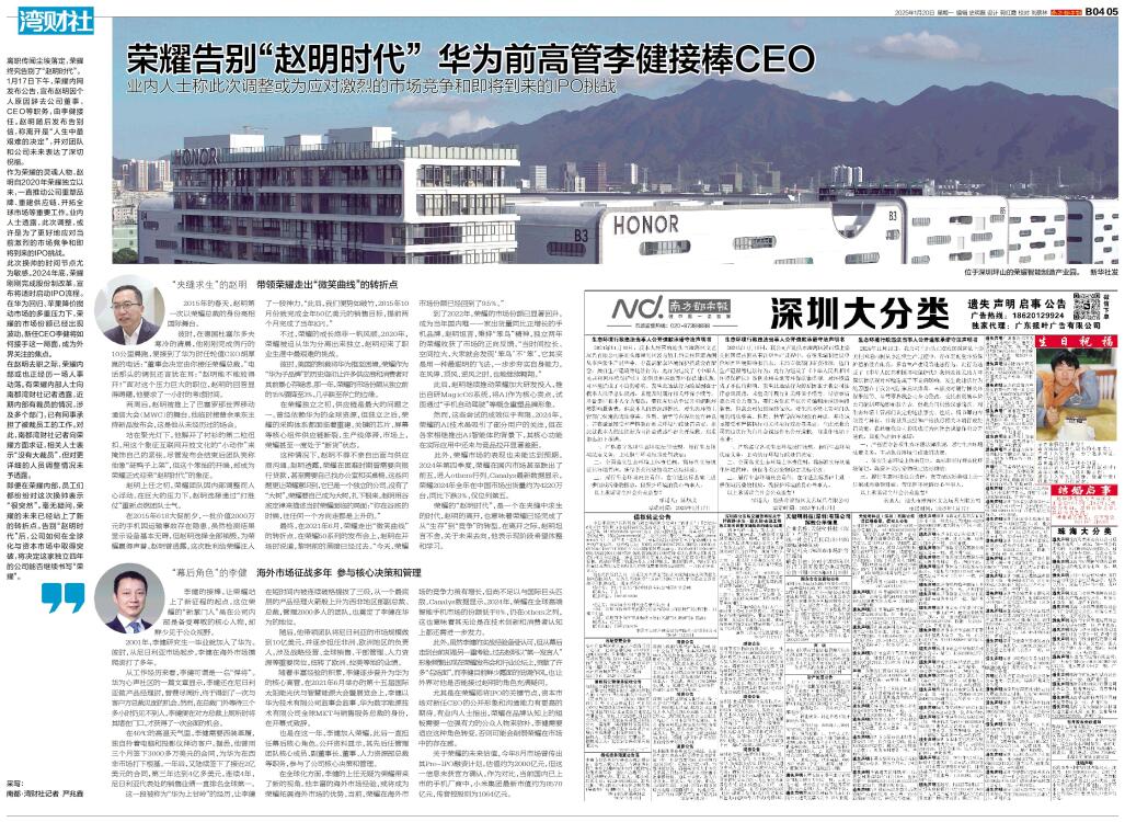荣耀告别“赵明时代” 华为前高管李健接棒CEO
