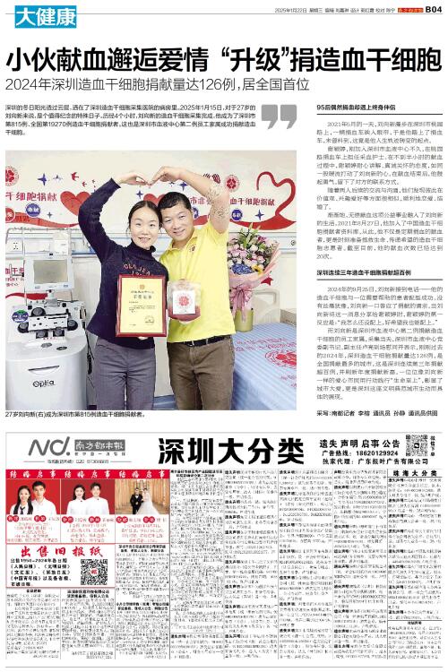 深圳的冬日阳光透过云层,洒在了深圳造血干细胞采集医院的病房里。2025年1月15日,对于27岁的刘向新来说,是个值得纪念的特殊日子。历经4个小时,刘向新的造血干细胞采集完成,他成为了深圳市第815