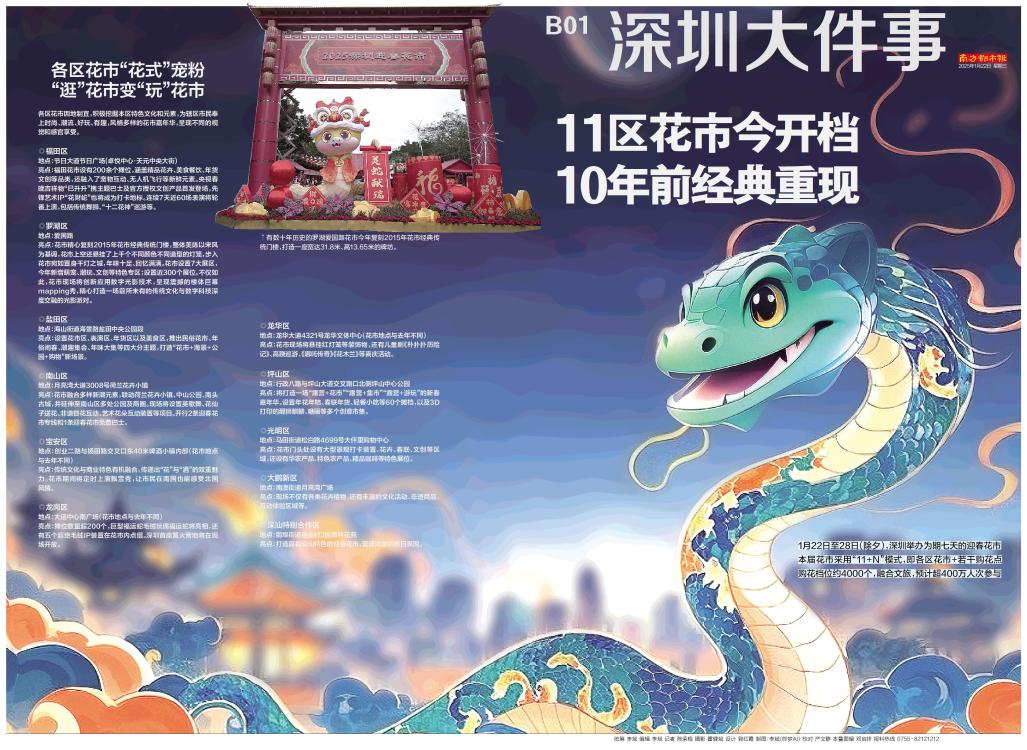 1月22日至28日(除夕),深圳举办为期七天的迎春花市 本届花市采用“11+N”模式,即各区花市+若干购花点 购花档位约4000个,融合文旅,预计超400万人次参与 各区花市“花式”宠粉