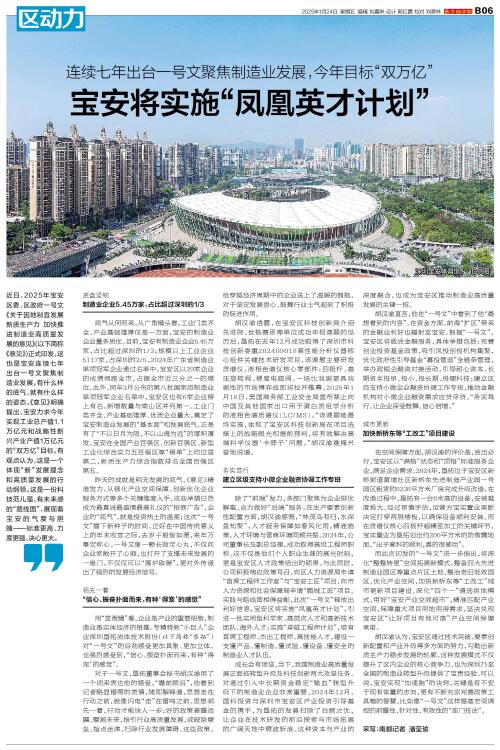 近日,2025年宝安区委、区政府一号文《关于因地制宜发展新质生产力 加快推进制造业高质量发展的意见》(以下简称《意见》)正式印发,这也是宝安连续七年出台一号文聚焦制造业发展。有什么样的底气,就有什