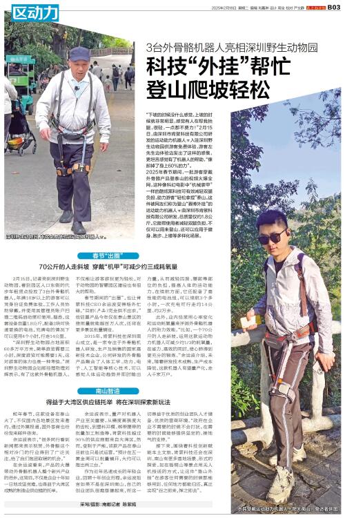 “下坡的时候没什么感觉,上坡的时候就非常明显,感觉有人在帮我抬腿,很轻,一点都不费力!”2月15日,由深圳市肯綮科技有限公司研发的运动助力机器人π入驻深圳野生动物园供游客免费体验,游客左先生边体验