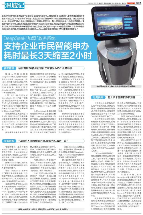 走进深圳市罗湖区政务服务中心的前台,迎面而来的数字人客服和智能导办机器人提供精准的智能咨询服务;中台上线“AI+智能填表”小助手,支持企业和群众智能申办,耗时由最长3天压缩至2小时;后台构建的“A