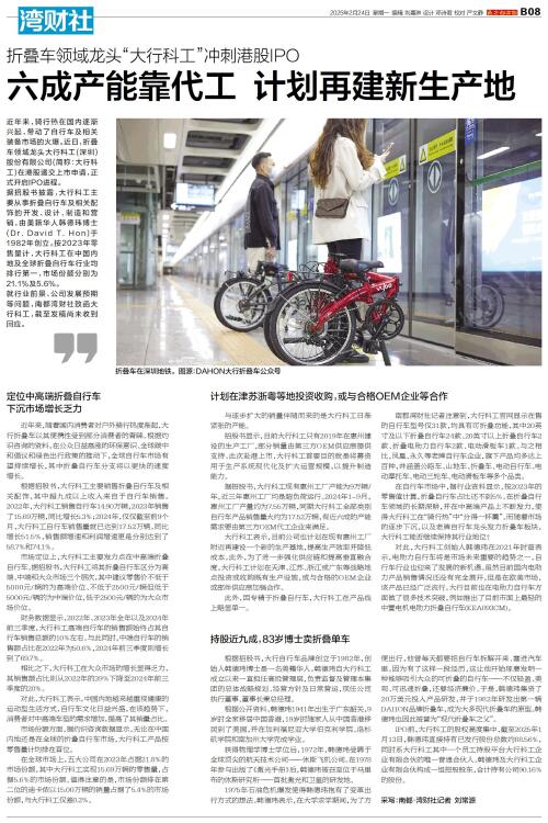 近年来,骑行热在国内逐渐兴起,带动了自行车及相关装备市场的火爆。近日,折叠车领域龙头大行科工(深圳)股份有限公司(简称:大行科工)在港股递交上市申请,正式开启IPO进程。 据招股书披露,大行科工