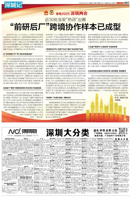 在深圳市七届人大六次会议上,市政府工作报告提到宝安的各项发展工作,从国际智能制造高地到世界级文旅地标,从深港合作示范区到湾区交通枢纽,近30处提及的宝安“热词”,勾勒出2024年的亮眼成绩单