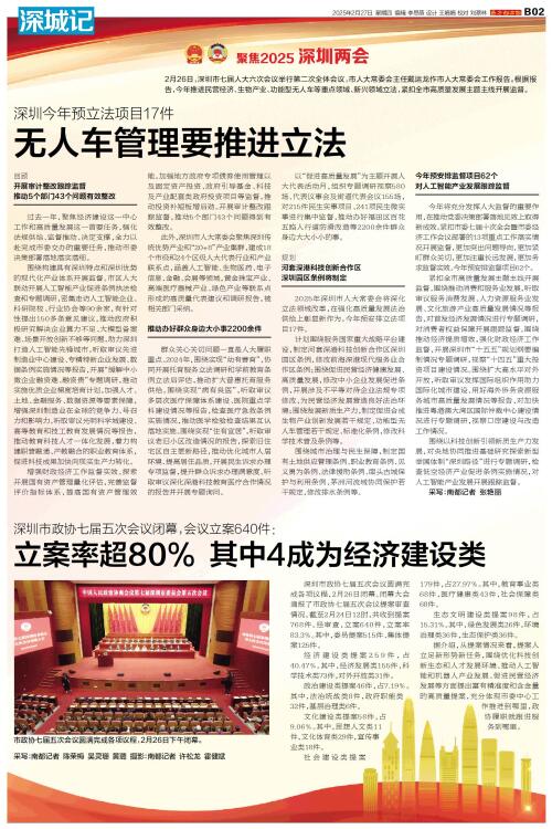 2月26日,深圳市七届人大六次会议举行第二次全体会议,市人大常委会主任戴运龙作市人大常委会工作报告。根据报告,今年推进民营经济、生物产业、功能型无人车等重点领域、新兴领域立法,紧扣全市高质量发展主