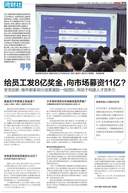 近日,南都湾财社报道安克创新对员工大手笔分红,引发外界关注。据安克创新内部人士透露,公司近日确有内部会议,会上有披露去年员工分红奖金达8亿、年收入破百万人数494人等数据,该组内部会议图片也被传出