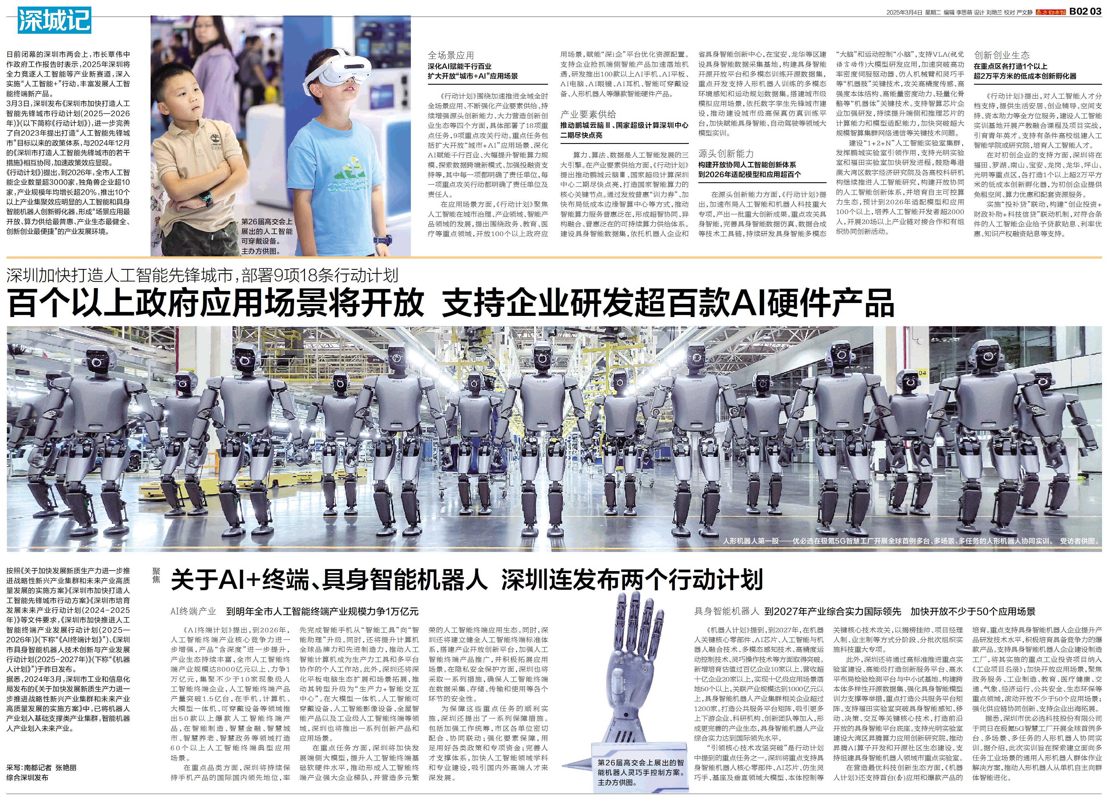 按照《关于加快发展新质生产力进一步推进战略性新兴产业集群和未来产业高质量发展的实施方案》《深圳市加快打造人工智能先锋城市行动方案》《深圳市培育发展未来产业行动计划(2024-2025年)》等文件要求,《深圳市加快推进人工智能终端产业发展行动计划(2025—2026年)》(下称“《AI终端计划》”)、《深圳市具身智能机器人技术创新与产业发展行动计划(2025-2027年)》(下称“《机器人计划》”)于昨日发布。