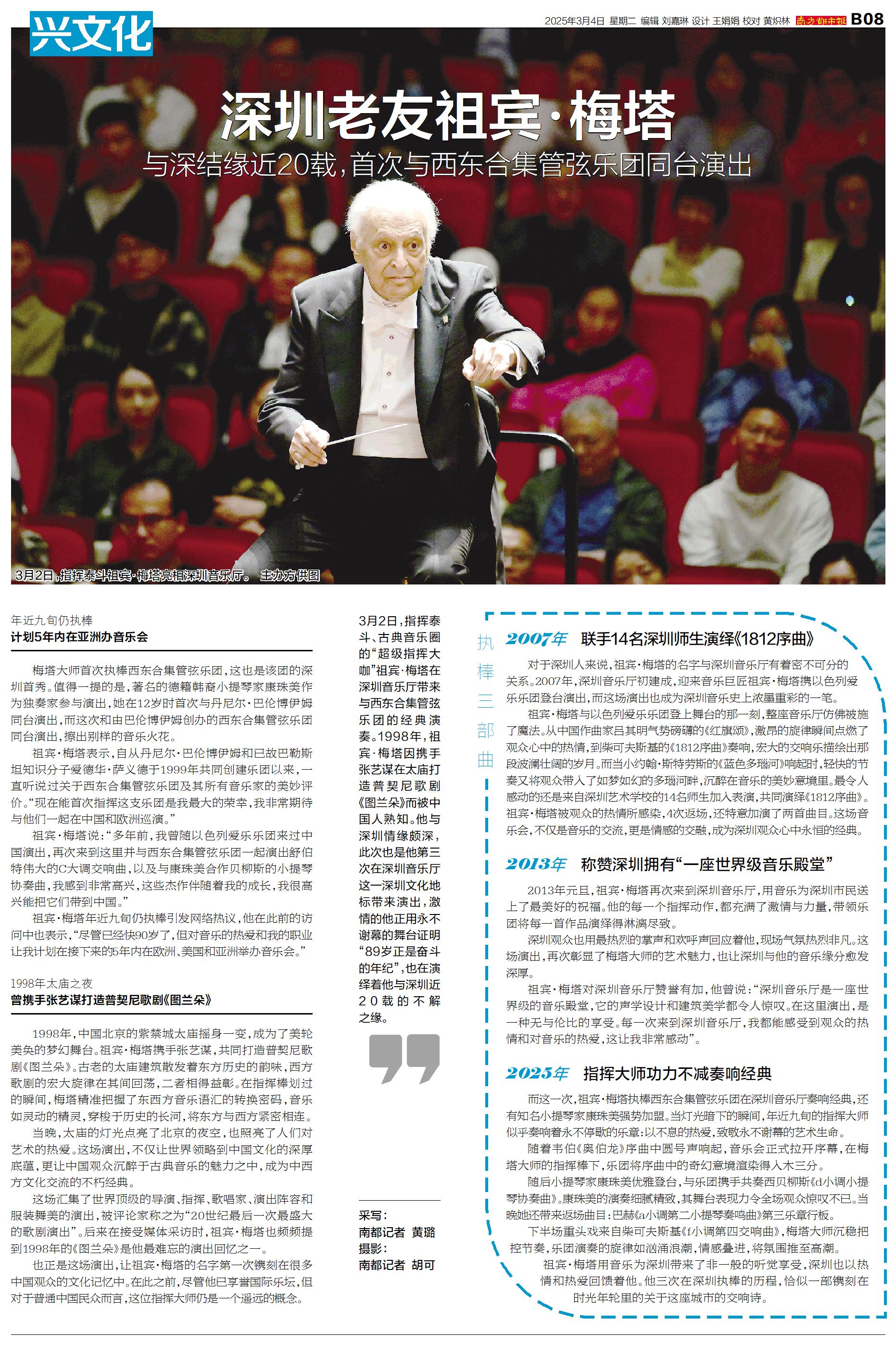 3月2日,指挥泰斗、古典音乐圈的“超级指挥大咖”祖宾·梅塔在深圳音乐厅带来与西东合集管弦乐团的经典演奏。1998年,祖宾·梅塔因携手张艺谋在太庙打造普契尼歌剧《图兰朵》而被中国人熟知。他与深圳情缘