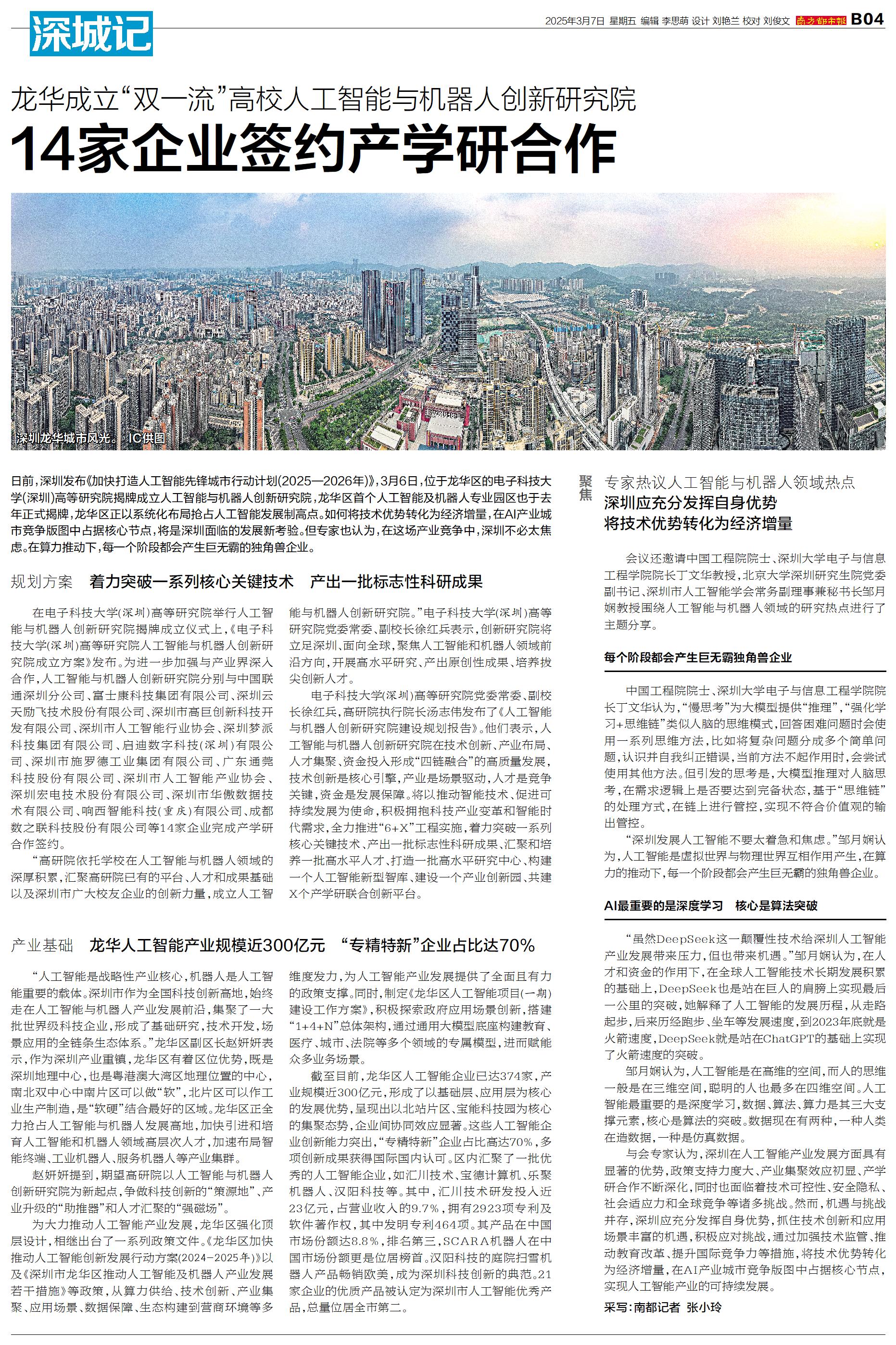 日前,深圳发布《加快打造人工智能先锋城市行动计划(2025—2026年)》,3月6日,位于龙华区的电子科技大学(深圳)高等研究院揭牌成立人工智能与机器人创新研究院,龙华区首个人工智能及机器人专业园