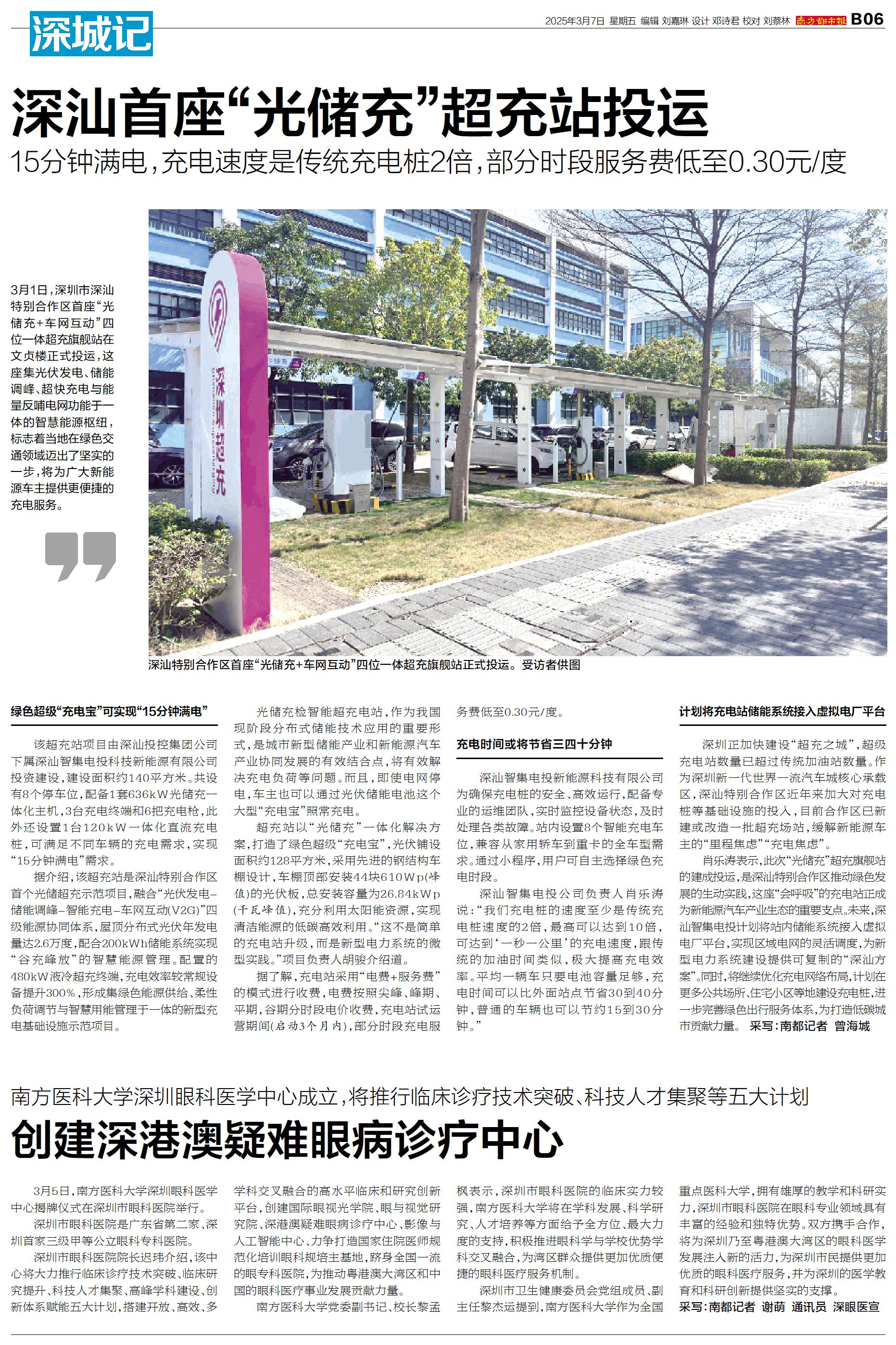 3月1日,深圳市深汕特别合作区首座“光储充+车网互动”四位一体超充旗舰站在文贞楼正式投运,这座集光伏发电、储能调峰、超快充电与能量反哺电网功能于一体的智慧能源枢纽,标志着当地在绿色交通领域迈出了坚