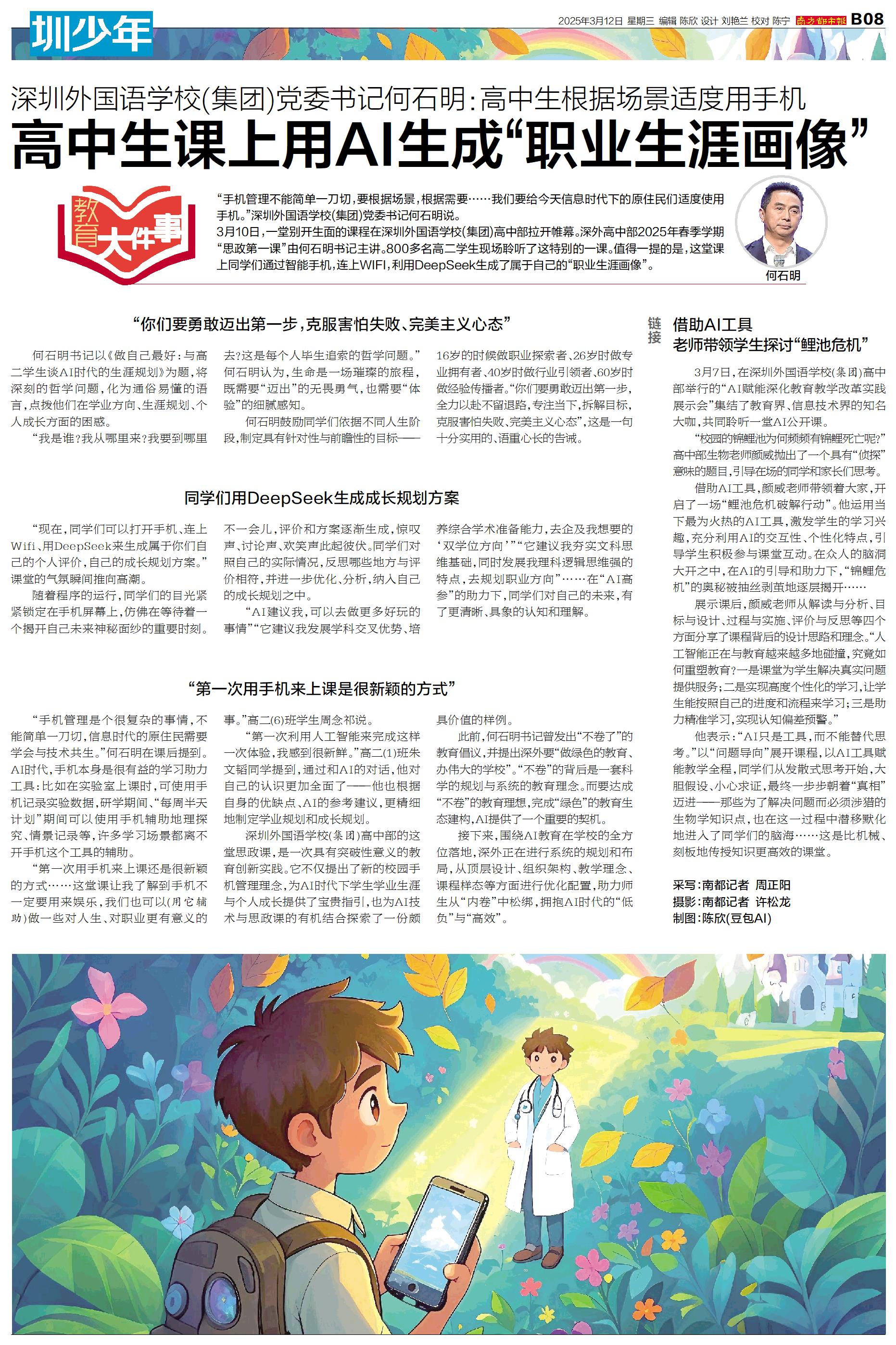 “手机管理不能简单一刀切,要根据场景,根据需要……我们要给今天信息时代下的原住民们适度使用手机。”深圳外国语学校(集团)党委书记何石明说。 3月10日,一堂别开生面的课程在深圳外国语学校(集团)
