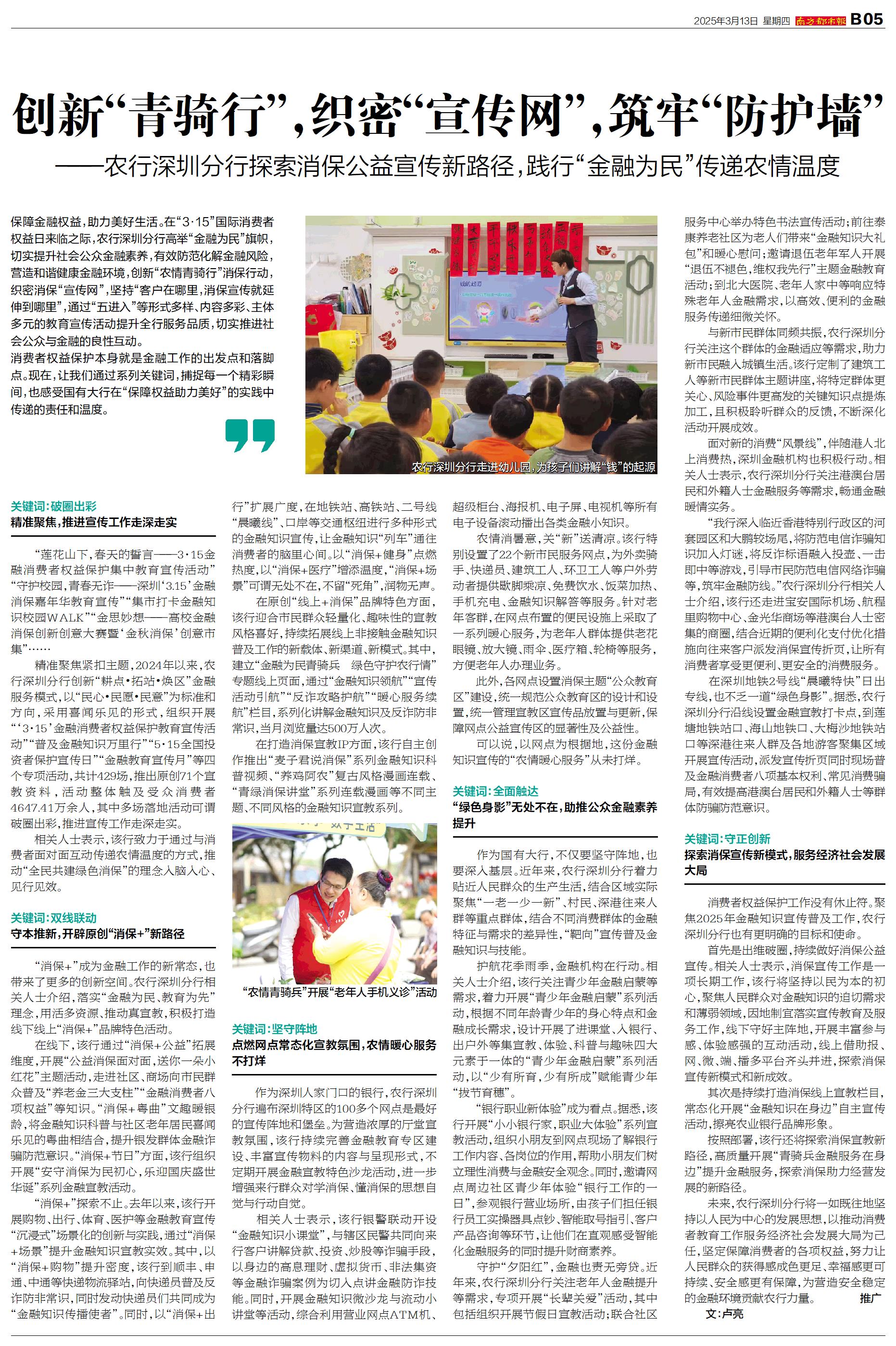 保障金融权益,助力美好生活。在“3·15”国际消费者权益日来临之际,农行深圳分行高举“金融为民”旗帜,切实提升社会公众金融素养,有效防范化解金融风险,营造和谐健康金融环境,创新“农情青骑行”消保行动,织密消保“宣传网”,坚持“客户在哪里,消保宣传就延伸到哪里”,通过“五进入”等形式多样、内容多彩、主体多元的教育宣传活动提升全行服务品质,切实推进社会公众与金融的良性互动。