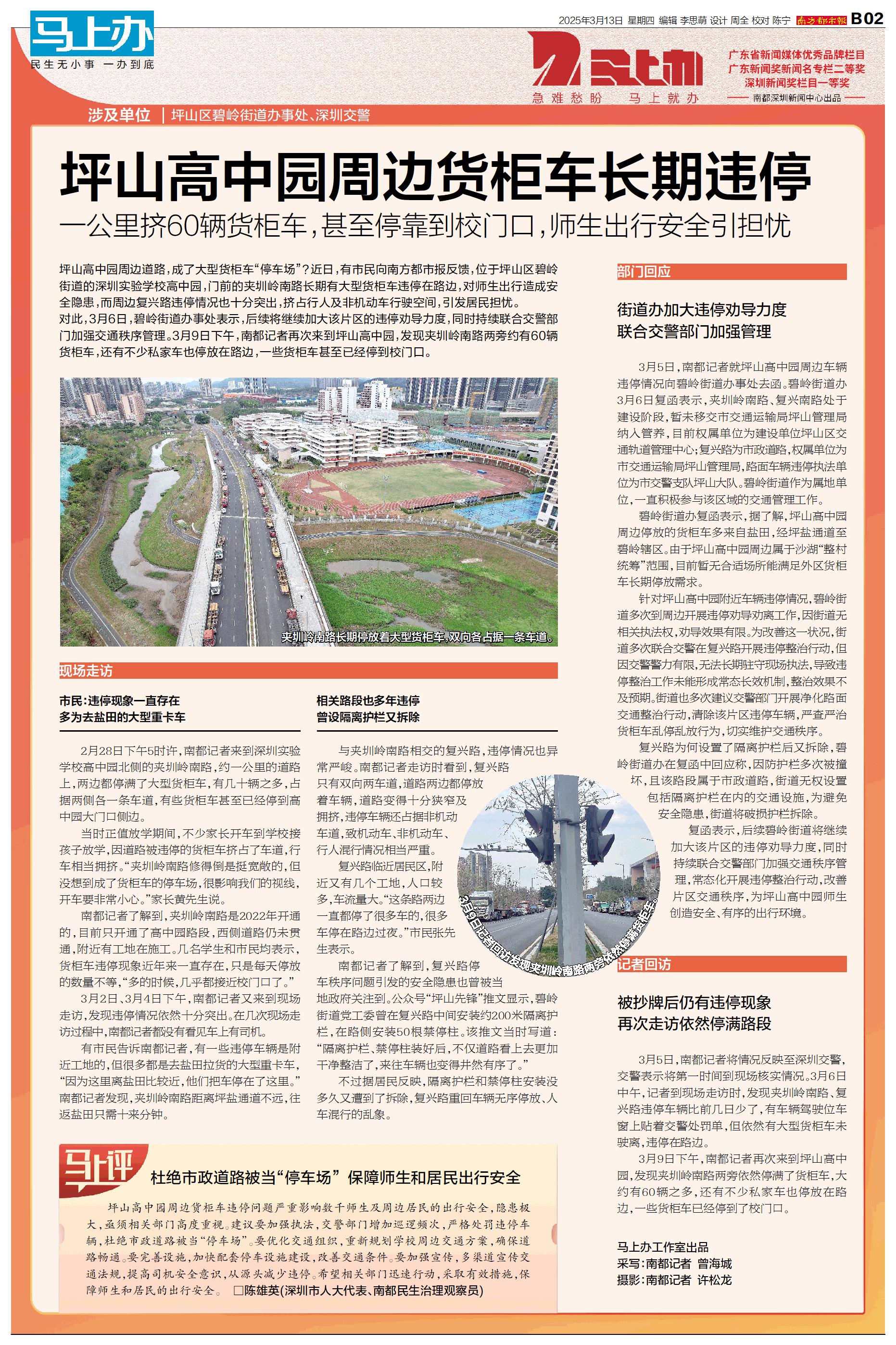涉及单位 坪山区碧岭街道办事处、深圳交警 坪山高中园周边道路,成了大型货柜车“停车场”?近日,有市民向南方都市报反馈,位于坪山区碧岭街道的深圳实验学校高中园,门前的夹圳岭南路长期有大型货柜车违