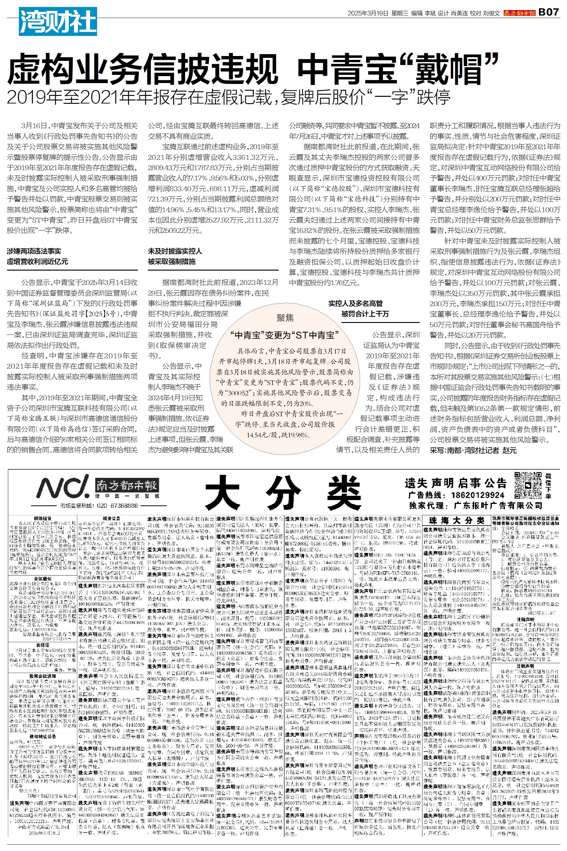 3月16日,中青宝发布关于公司及相关当事人收到《行政处罚事先告知书》的公告及关于公司股票交易将被实施其他风险警示暨股票停复牌的提示性公告。公告显示由于2019年至2021年年度报告存在虚假记载,未及时披露实际控制人被采取刑事强制措施,中青宝及公司实控人和多名高管均被给予警告并处以罚款,中青宝股票交易则被实施其他风险警示,股票简称也将由“中青宝”变更为“ST中青宝”。昨日开盘后ST中青宝股价出现“一字”跌停。
