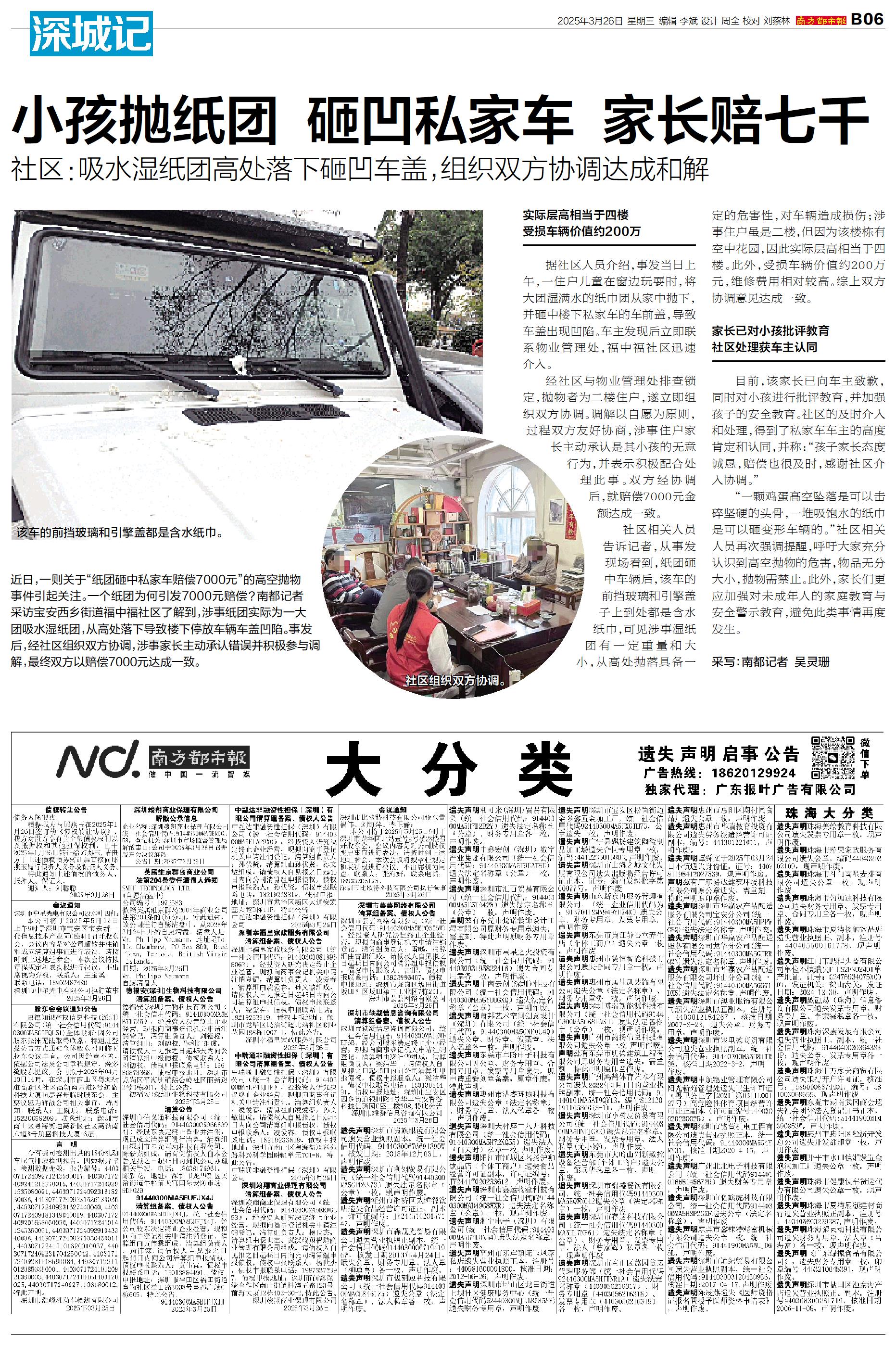 近日,一则关于“纸团砸中私家车赔偿7000元”的高空抛物事件引起关注。一个纸团为何引发7000元赔偿?南都记者采访宝安西乡街道福中福社区了解到,涉事纸团实际为一大团吸水湿纸团,从高处落下导致楼下停