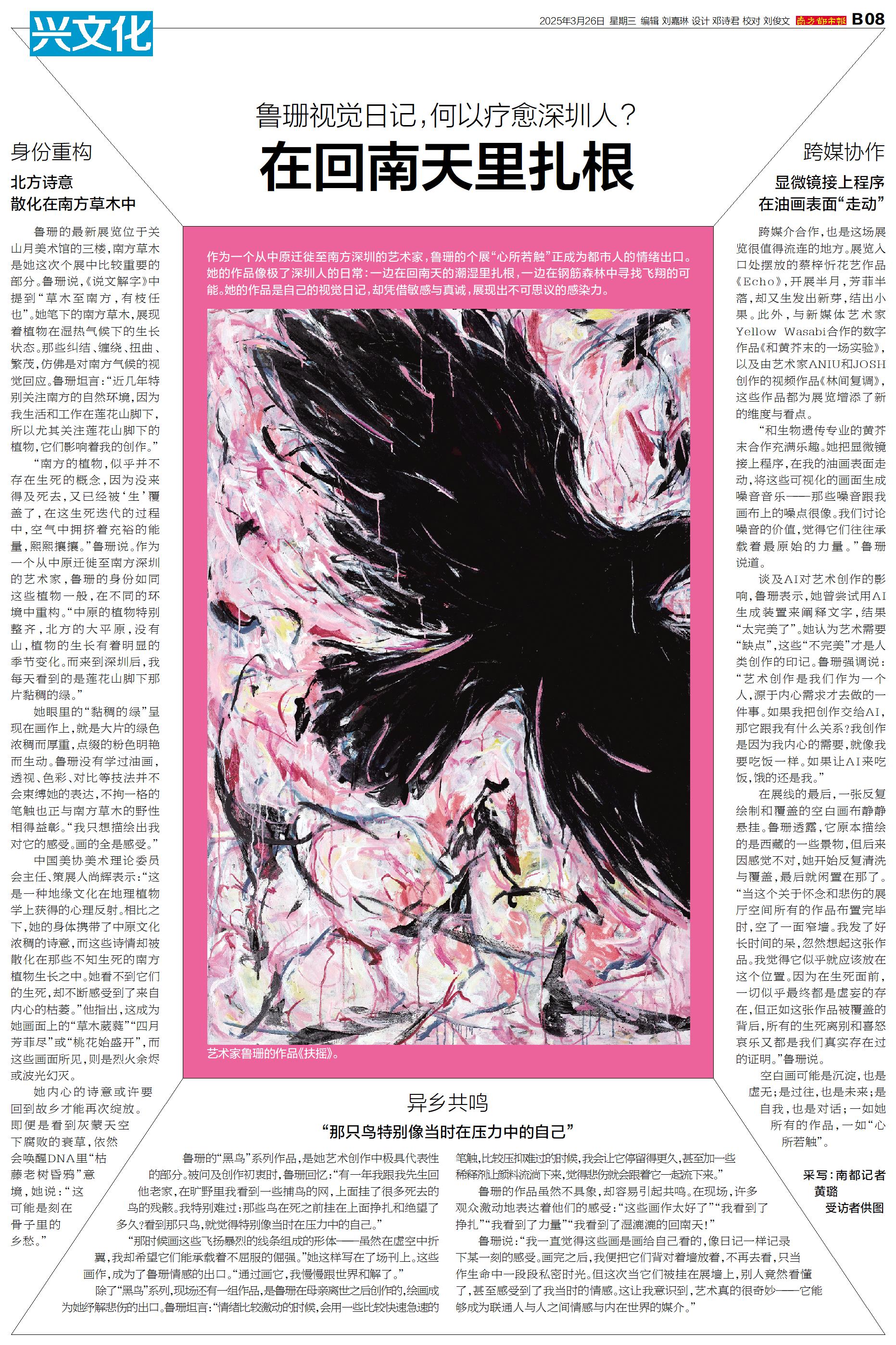 作为一个从中原迁徙至南方深圳的艺术家,鲁珊的个展“心所若触”正成为都市人的情绪出口。她的作品像极了深圳人的日常:一边在回南天的潮湿里扎根,一边在钢筋森林中寻找飞翔的可能。她的作品是自己的视觉日记,