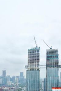 南都讯 近日,深圳前海自贸时代中心项目完成高空连廊提升。本次提升的高空连廊分为两层,位于两栋超200米的塔楼之间,为前海片区最高连廊、深圳在施最高连廊。 项目团队创新采用“分体式连廊整体提升安装