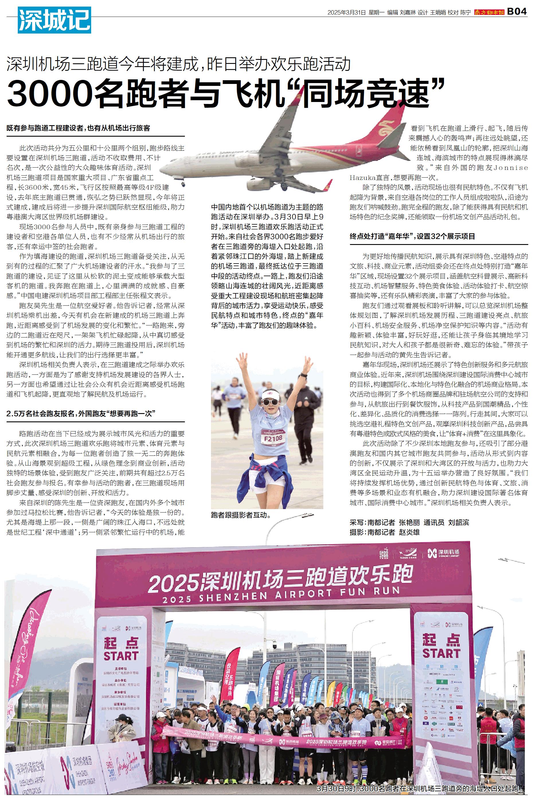 中国内地首个以机场跑道为主题的路跑活动在深圳举办。3月30日早上9时,深圳机场三跑道欢乐跑活动正式开始。来自社会各界3000名跑步爱好者在三跑道旁的海堤入口处起跑,沿着紧邻珠江口的外海堤,踏上新建