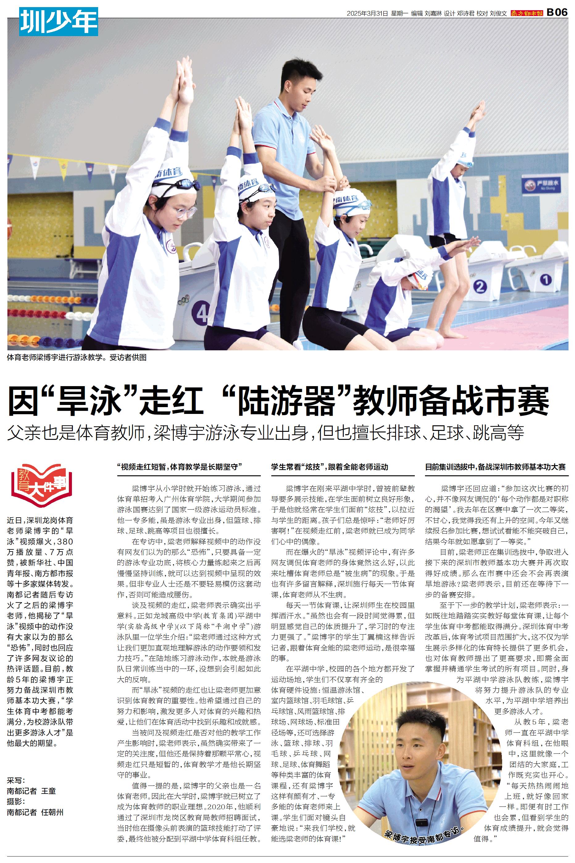 近日,深圳龙岗体育老师梁博宇的“旱泳”视频爆火,380万播放量、7万点赞,被新华社、中国青年报、南方都市报等十多家媒体转发。南都记者随后专访火了之后的梁博宇老师,他揭秘了“旱泳”视频中的动作没有大