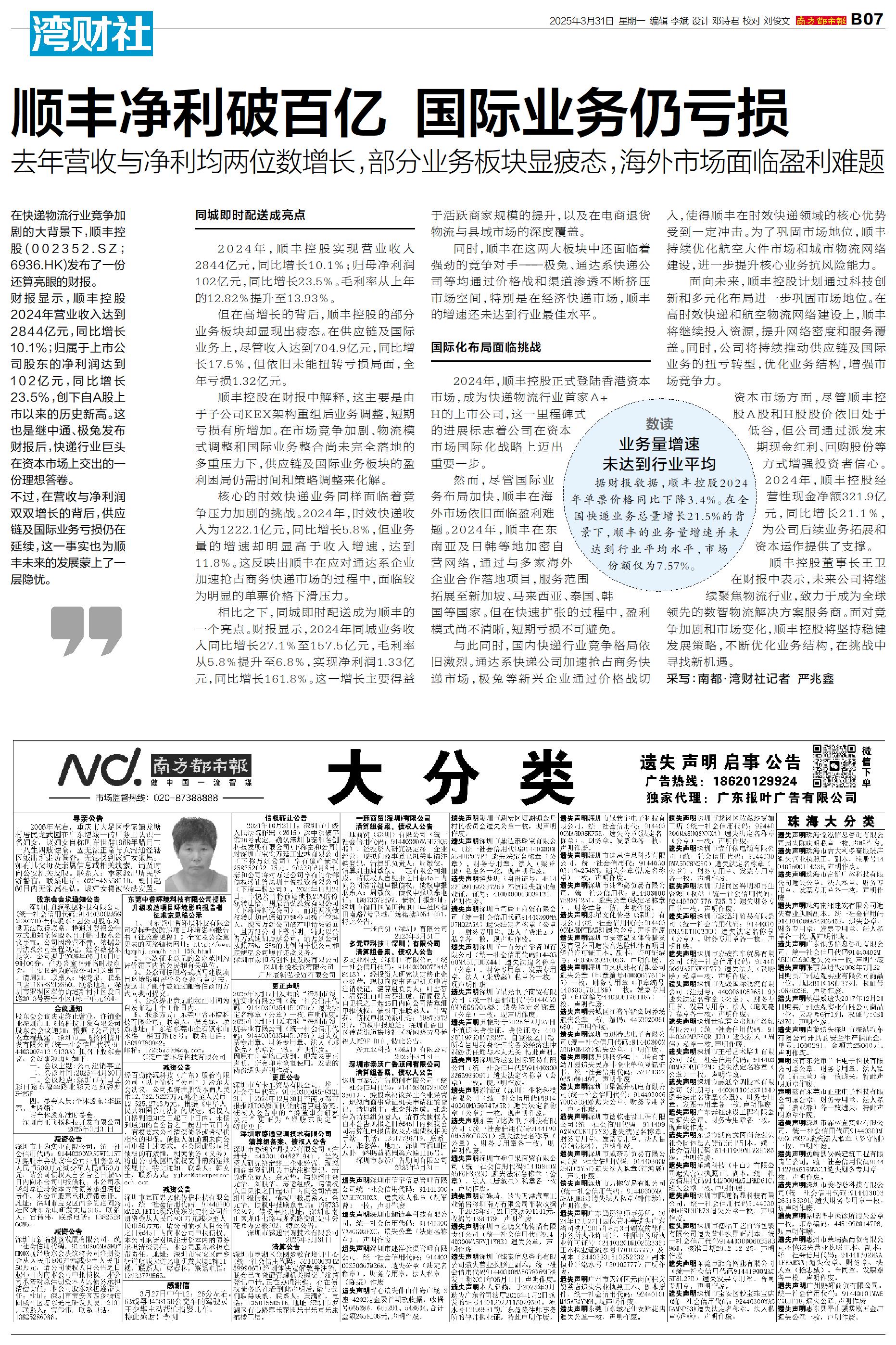 在快递物流行业竞争加剧的大背景下,顺丰控股(002352.SZ;6936.HK)发布了一份还算亮眼的财报。 财报显示,顺丰控股2024年营业收入达到2844亿元,同比增长10.1%;归属于上市公