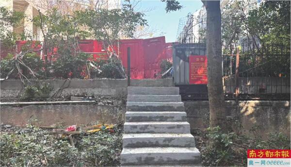 南都·奥一新闻记者走访城市假日花园,看到小区有台阶可以通往十五峯花园,该出入口处有红色围挡。
