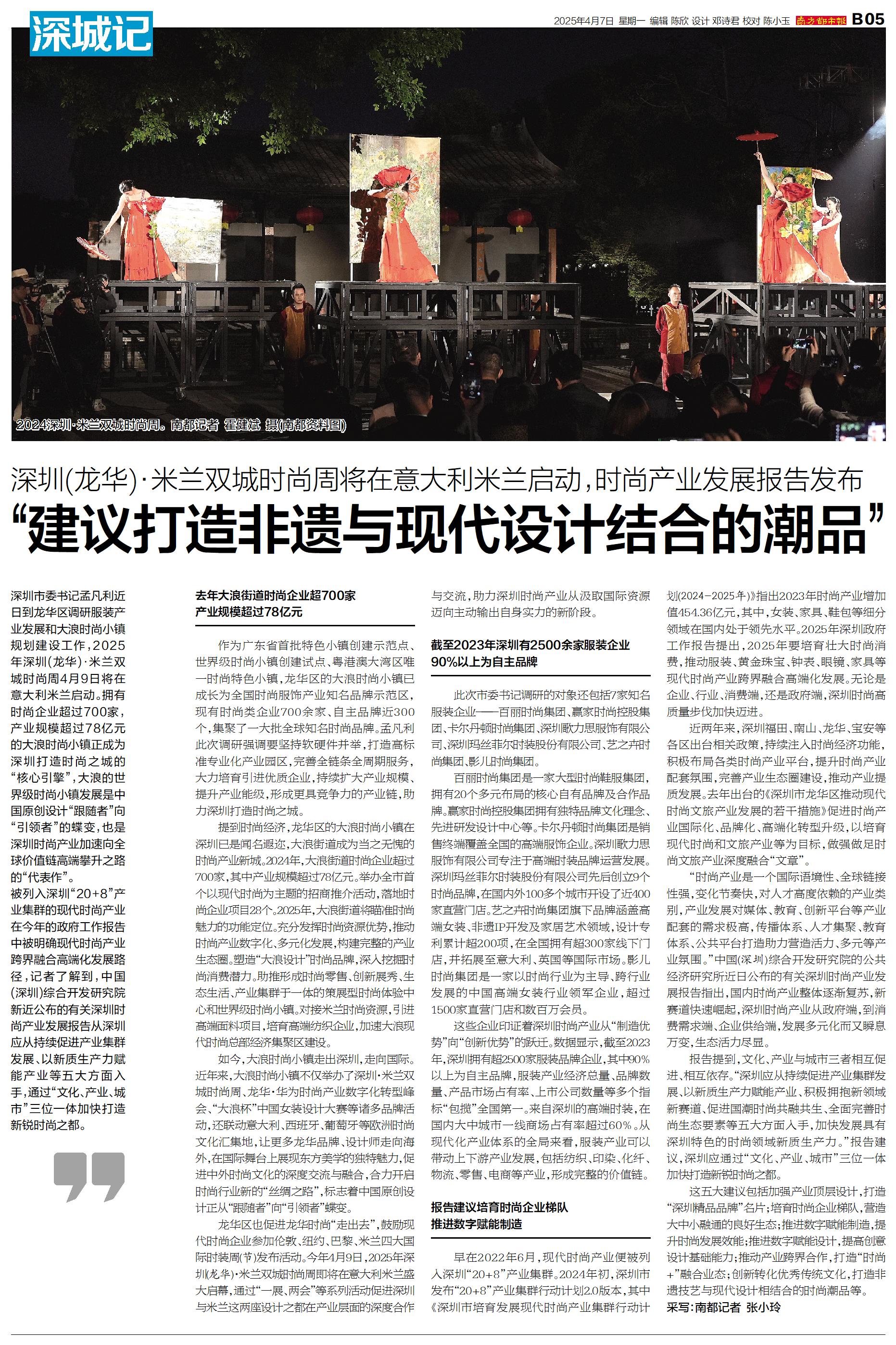 深圳市委书记孟凡利近日到龙华区调研服装产业发展和大浪时尚小镇规划建设工作,2025年深圳(龙华)·米兰双城时尚周4月9日将在意大利米兰启动。拥有时尚企业超过700家,产业规模超过78亿元的大浪时尚小镇正成为深圳打造时尚之城的“核心引擎”,大浪的世界级时尚小镇发展是中国原创设计“跟随者”向“引领者”的蝶变,也是深圳时尚产业加速向全球价值链高端攀升之路的“代表作”。